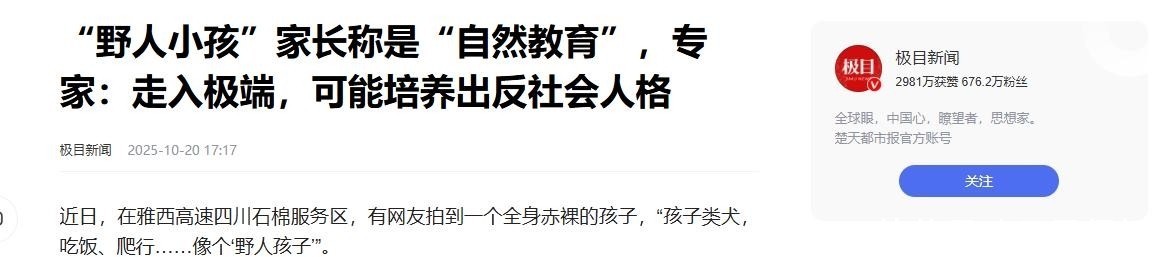 极目新-10-20:“野人小孩”家长称是“自然教育”,专家:走入极端,可能培养出反社会人格